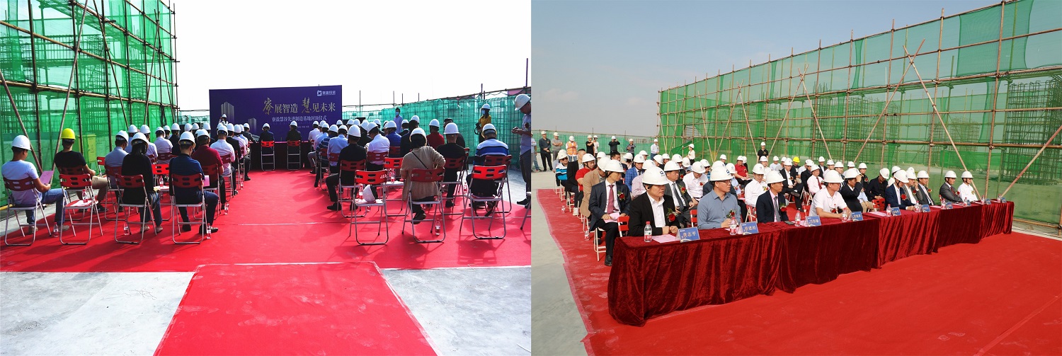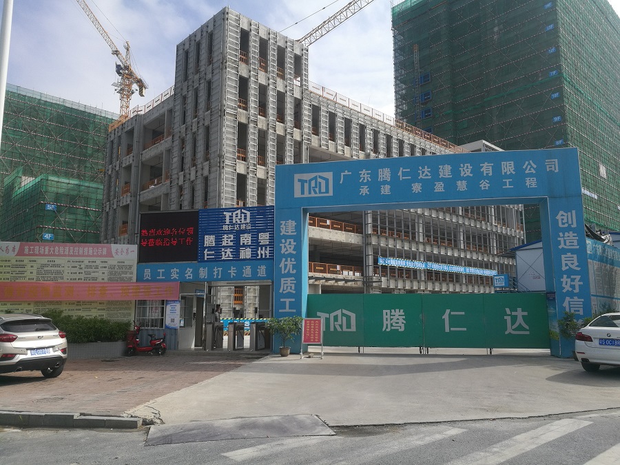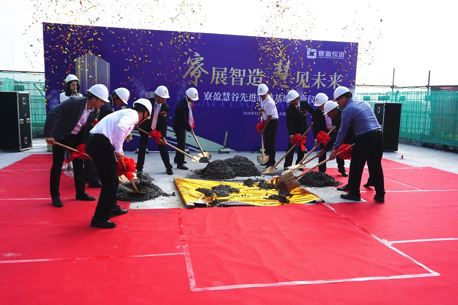 2020年11月24日,在位于东莞市寮步镇寮盈慧谷的施工现场里,被脚手架与绿色施工网严密包裹的寮盈慧谷先进制造基地里,“封顶大吉”的红色标语高高悬挂其上。