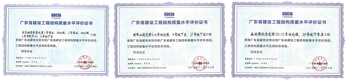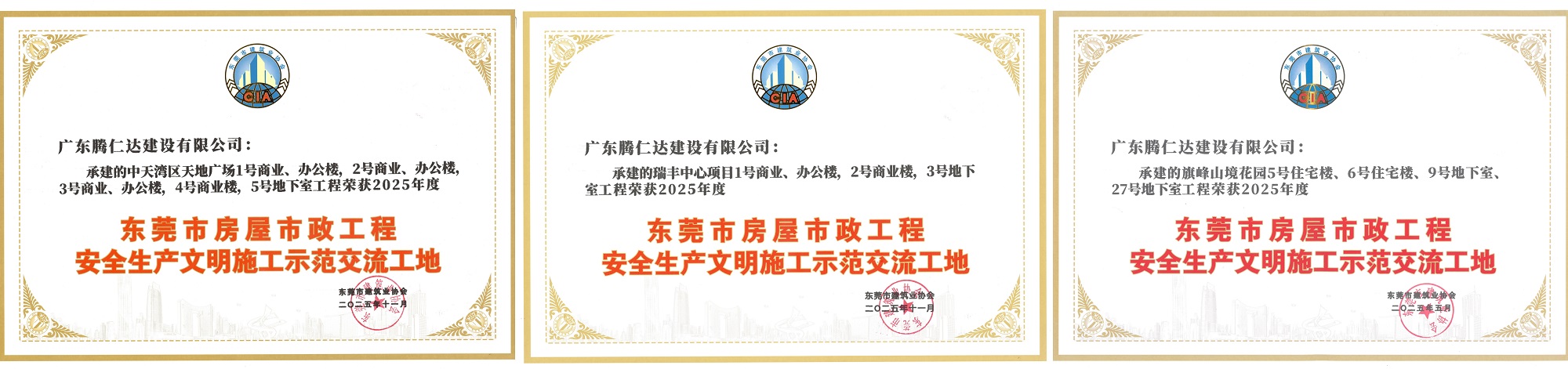 “全国建设工程项目施工安全生产标准化工地奖”代表了中国建设工程在安全生产管理方面的最高水平;而“广东省建设工程施工质量评价证书”与“广东省建设工程结构质量水平评价证书”均由广东省建筑协会颁发,是广东省建设工程质量先进水平的重要标志;“东莞市房屋市政工程安全生产文明施工示范交流工地”则由东莞市建筑业协会评定,代表了市级安全生产与文明施工的标杆。能够荣获这些权威奖项,不仅是对各项目在工程品质、安全管理与工艺水平上的高度认可,也是对企业精细化管理与卓越执行力的充分肯定。此次多项荣誉的获得,有力彰显了公司的专业实力与品牌形象,为公司未来的持续发展与品质提升奠定了坚实基础。