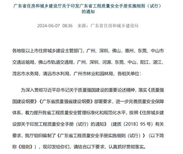 关于印发广东省工程质量安全手册实施细则(试行) 的通知